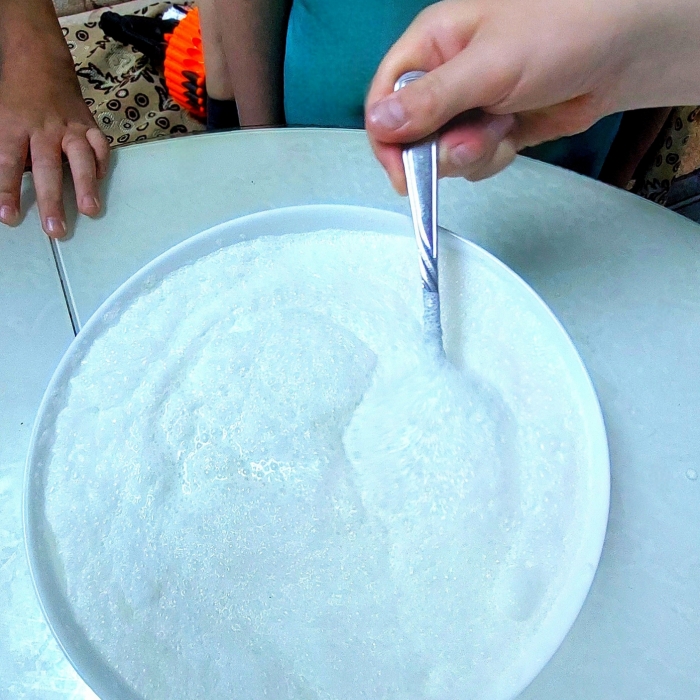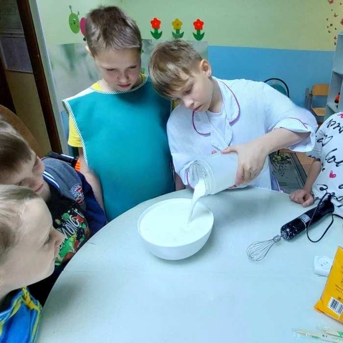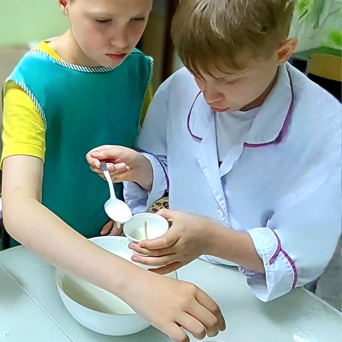 Мороженое для ребят желанное лакомство при любых погодных условиях. С огромным удовольствием в процессе приготовления и любопытством в отношении конечного результата ребята поэтапно выполняли необходимую работу. При этом ребята постарше готовили, а ребята помладше наблюдали рядом за процессом. К своему мороженому ребята решили еще добавить фруктовое пюре из киви.