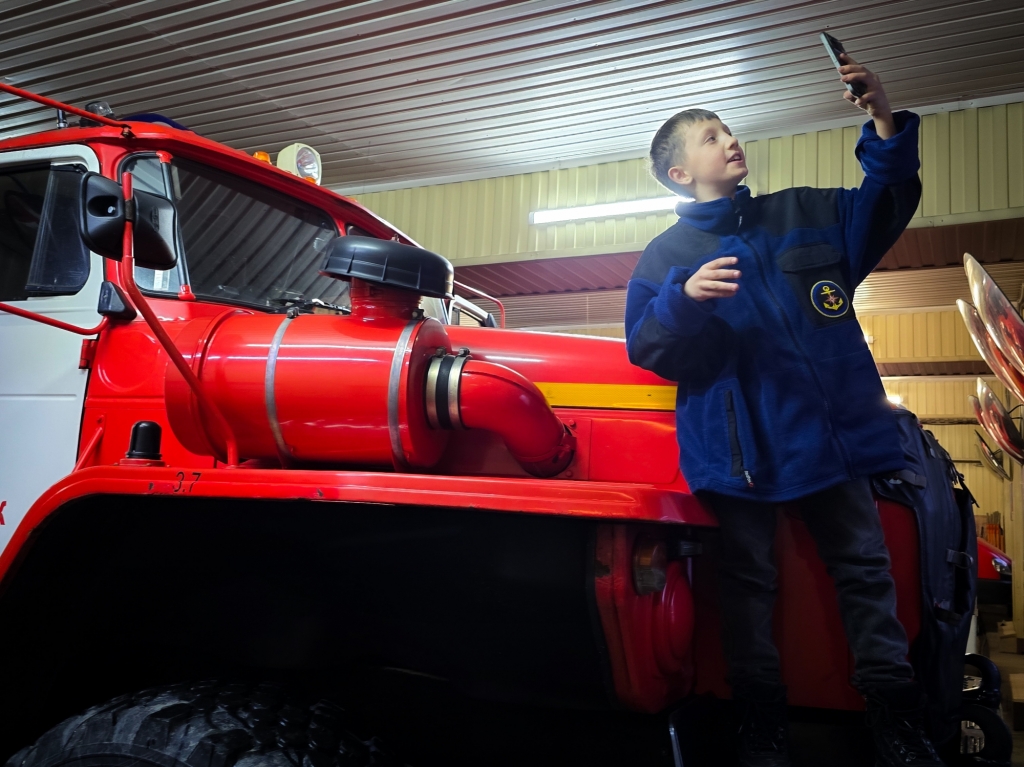 Артём проявил активность и любознательность, задавая множество вопросов о пожарных машинах, оборудовании и особенностях работы, а также делился своими, достаточно глубокими, знаниями о важности службы.