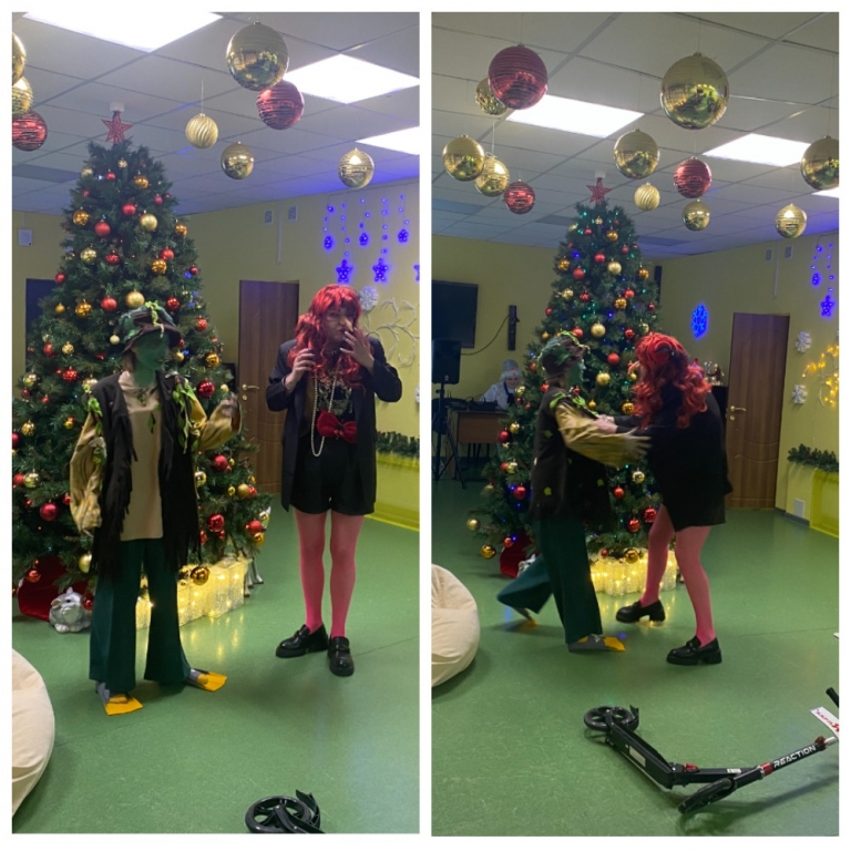 Забавный Снеговик развлекал всех участников новогодними песнями, музыкальными заданиями. Леший и Баба Яга, встретившись друг с другом, как обычно захотели испортить праздник, подговорив разбойников украсть Снегурочку. Но как в любой сказке добро победило зло!