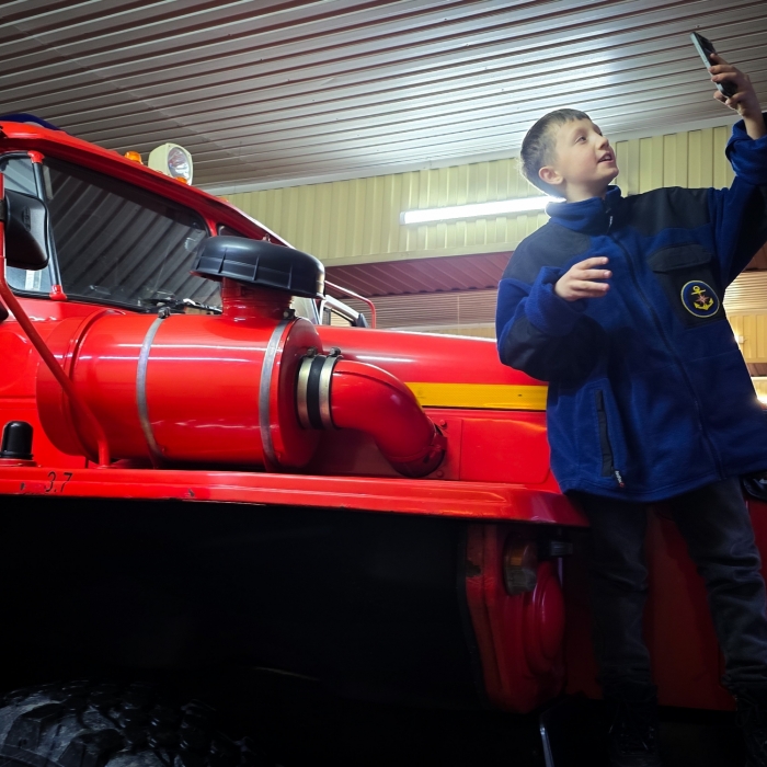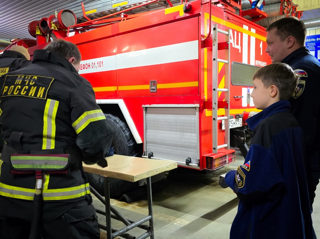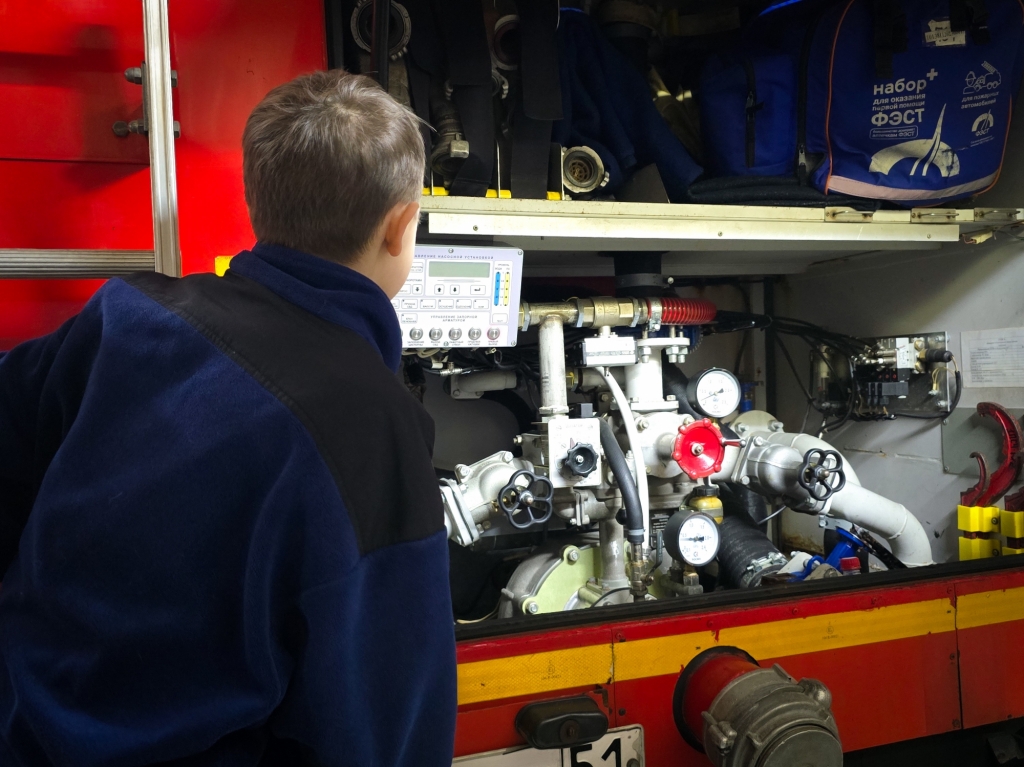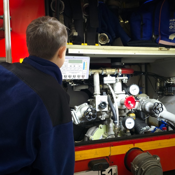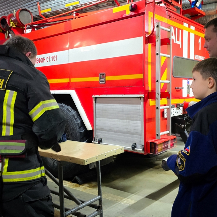 Артём проявил активность и любознательность, задавая множество вопросов о пожарных машинах, оборудовании и особенностях работы, а также делился своими, достаточно глубокими, знаниями о важности службы.