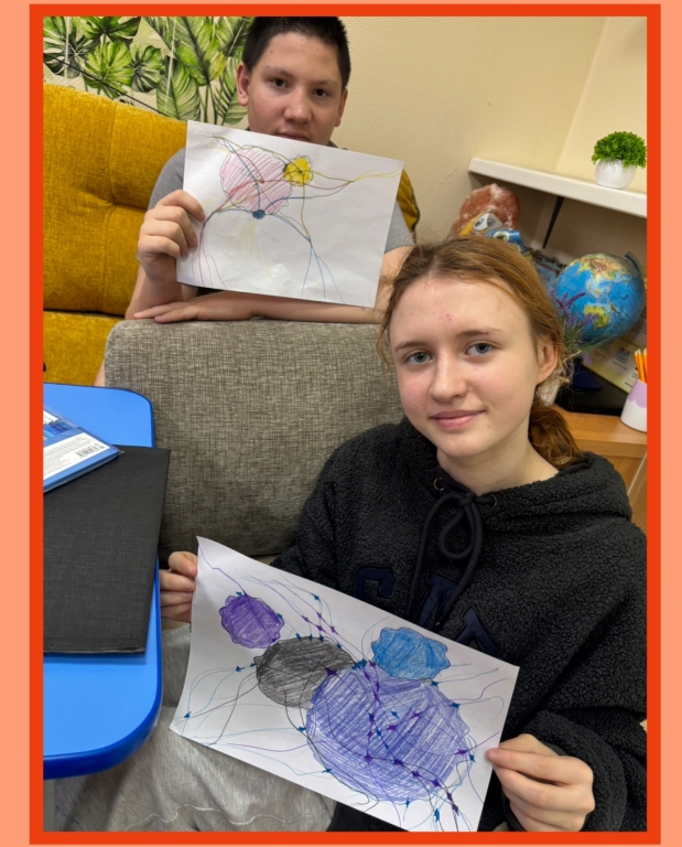 На занятие арт-терапии с педагогом-психологом дети погружаются в мир нейрографики. Здесь яркие образы становятся зеркалом души, где зигзаги и волны отражают не только радости, но и глубокие переживания. Игра с цветами и формами пробуждает воображение и учит мыслить свободно. Нейрографика помогает детям расслабиться, избавиться от тревог и окунуться в мир творчества. В дружеском кругу этот метод становится мостом для общения, где каждый делится своими мыслями и чувствами, учится понимать и поддерживать друг друга, создавая вместе танец души на бумажном холсте.